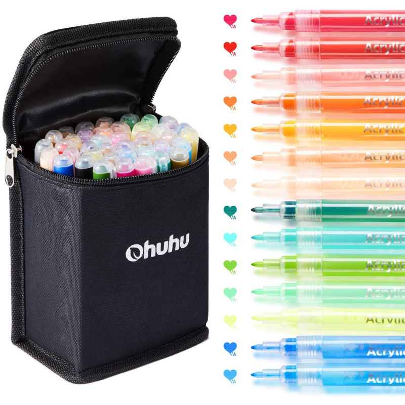 Σετ ακρυλικοί μαρκαδόροι OHUHU με 40 ζωντανά χρώματα. Κάθε σετ ακρυλικών μαρκαδόρων περιέχει 4 μεταλλικά χρώματα (χρυσό, ασημί, κίτρινο και μπρονζέ), 5 φωσφορικά χρώματα (κίτρινο, πορτοκαλί, ροζ, πράσινο και μοβ), 2 χρώματα του δέρματος (λευκό και γκρι), και 29 βασικά χρώματα (ροζ πράσινο, πράσινο, μπλε πεταλούδα, βερμιγιόν, μπλε, βιολετί μπλε, κόκκινο, πορτοκαλί, ροδοκόκκινο, κίτρινο πεπόνι, κίτρινο λεμόνι, ανοιχτό καρυδί, ανοιχτό καφέ, ανοιχτό μπλε, ανοιχτό βιολετί, σκούρο πράσινο της ελιάς, σκούρο καρυδί). Όποιες κι αν είναι οι ανάγκες σας, οι λεπτές πλαστικές μύτες 0,7-2 mm θα σας δώσουν ισχυρές, καθαρές γραμμές. Είναι ιδανικοί για ζωγραφική σε πέτρες, ξύλο, ύφασμα, παπούτσια από καμβά, κούπες, γυαλί και πλαστικό. Επιπλέον, μπορείτε να χρησιμοποιήσετε αυτόν τον μαρκαδόρο για ζωγραφική σε βιτρό, σε καμβά και πολλά άλλα.