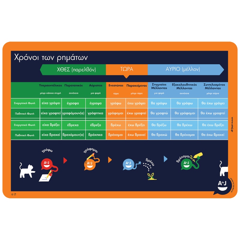 Ένα σουπλά που συγκεντρώνει με τη μορφή χρονοδιαγράμματος τους κανόνες κλίσης ρημάτων και τους παρουσιάζει με κατανοητό, οργανωμένο και παραστατικό τρόπο. Μπορεί να αξιοποιηθεί και ως βοήθημα μελέτης.
