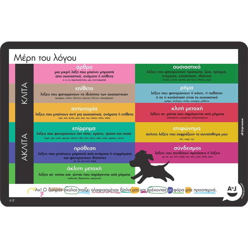 Ένα πολύχρωμο σουπλά που με ολοκληρωμένο τρόπο βοηθάει τα παιδιά στην αναγνώριση των κύριων μερών του λόγου της Ελληνικής γλώσσας. Παρουσιάζει συγκεντρωμένα και με παραδείγματα τα διαφορετικά μέρη του λόγου, ενώ μπορεί να αξιοποιηθεί και ως βοήθημα μελέτης.