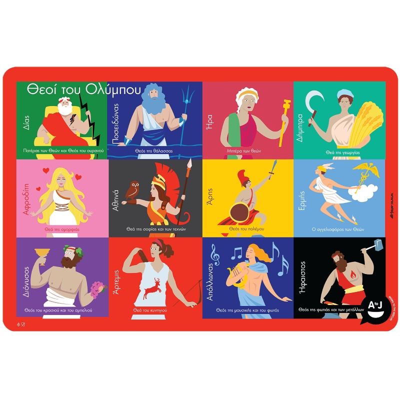 Με τον Δία, πατέρα των θεών, στην πρώτη θέση, το σουπλά αυτό απεικονίζει με τον ιδιαίτερο σύγχρονο σχεδιασμό του όλους  εκείνους που σύμφωνα με τη δική μας αρχαία ελληνική ιστορία κατείχαν μια ξεχωριστή θέση στον Όλυμπο.