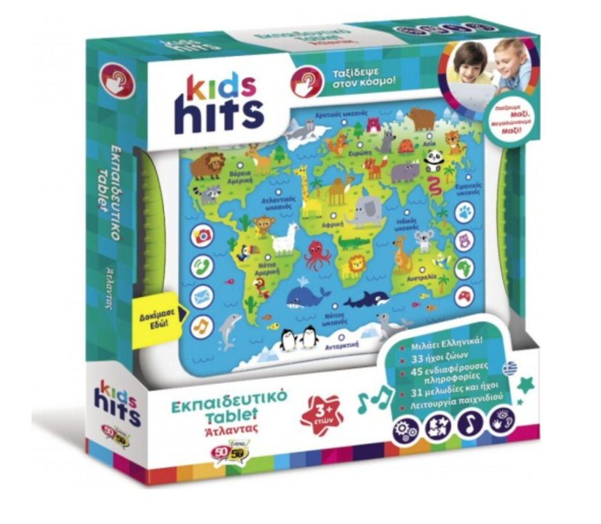 Το Tablet ‘Ατλαντας είναι ένα εκπαιδευτικό διαδραστικό παιχνίδι που εισάγει το παιδί στον κόσμο της γνώσης! Με αυτό το πρωτότυπο παιχνίδι tablet το παιδί μαθαίνει ενδιαφέρουσες πληροφορίες για τα ζώα του κόσμου, τις ηπείρους και τους ωκεανούς. Ο πολύχρωμος σχεδιασμός, οι ήχοι ζώων και οι πρωτότυπες μελωδίες προσφέρουν ώρες ψυχαγωγίας, βοηθώντας στην ανάπτυξη των αισθητηριακών δεξιοτήτων και της λογικής. Το πρακτικό σχήμα και η ποικιλία εκπαιδευτικού περιεχομένου και κουίζ, κάνουν το Tablet ‘Ατλαντα ένα από τα δημοφιλέστερα παιχνίδια!