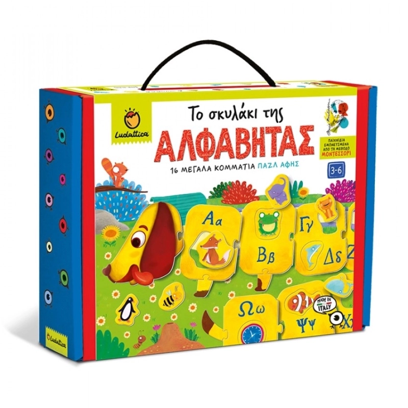 Ένα μεγάλο παζλ της αλφαβήτου σε χαριτωμένο σχήμα σκύλου, που αποτελείται από αλληλένδετα πλακίδια τα οποία μαθαίνουν στα παιδιά να αναγνωρίζουν τα γράμματα της ελληνικής αλφαβήτου.