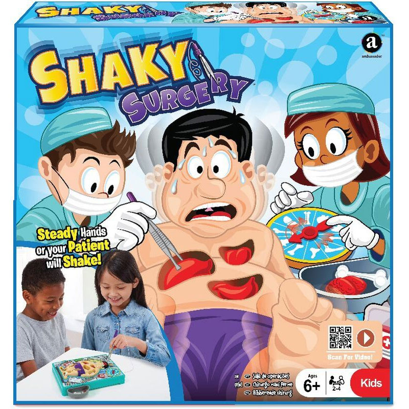 MAM Επιτραπέζιο Shaky Surgery (GPF2203). Πάρτε μια βαθιά ανάσα, σταθεροποιήστε τα χέρια σας και ετοιμαστείτε για το χειρουργείο! Οι παίκτες περιστρέφουν εναλλάξ το βέλος για να αποφασίσουν ποια μέρη του σώματος πρέπει να αφαιρεθούν και στη συνέχεια πρέπει να αφαιρέσουν προσεκτικά το συγκεκριμένο μέρος από τον ασθενή χρησιμοποιώντας το τσιμπιδάκι, πριν το ρίξουν στο δίσκο συλλογής. Προσέξτε όμως – αν αγγίξετε το λάθος μέρος, ο ασθενής σας θα κουνηθεί και θα αποβληθείτε! Ποιος θα είναι αυτός που θα σώσει τον ασθενή;! Για 2 – 4 παίκτες. Συνιστάται για ηλικίες 6 ετών και άνω. Διαστάσεις προίόντος: 26 (Π) x 6,3 (Υ) x 18 (Μ) cm.