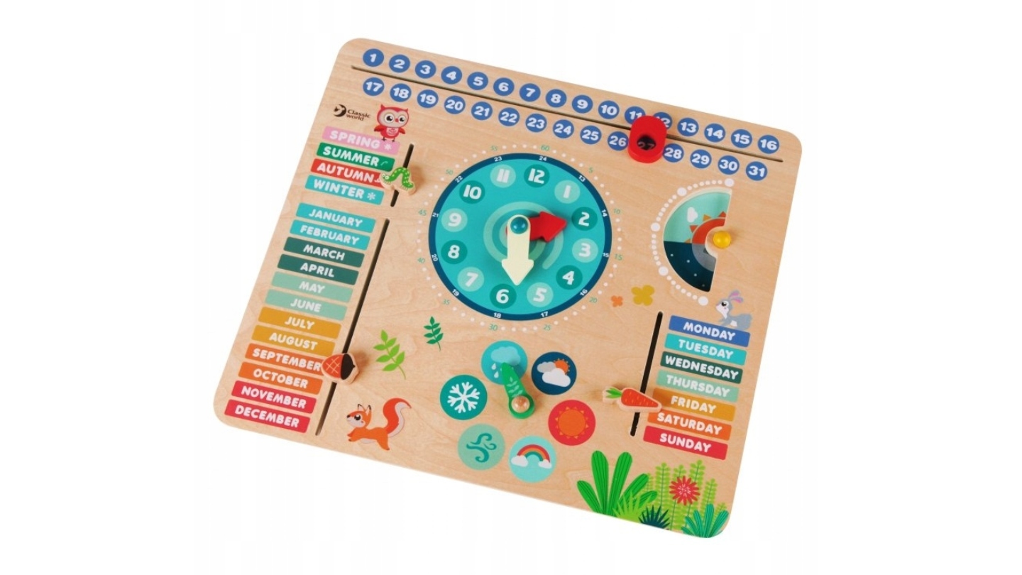 Το Εκπαιδευτικό Ημερολόγιο από τη διάσημη μάρκα Classic World είναι το τέλειο προϊόν για την εκμάθηση των ημερομηνιών και των ημερών της εβδομάδας. Το εκπαιδευτικό παιχνίδι είναι κατασκευασμένο από ξύλο υψηλής ποιότητας , βαμμένο με μη τοξικά χρώματα ασφαλή για παιδιά. Το ημερολόγιο σημειώνεται με την ημέρα της εβδομάδας και τον μήνα, το όνομα του μήνα, την ώρα, τον καιρό και την ώρα της ημέρας. Το παιδί μπορεί να παίρνει το ημερολόγιο σε ένα ταξίδι και να ρυθμίζει συνεχώς τις καιρικές συνθήκες έξω από το παράθυρο.