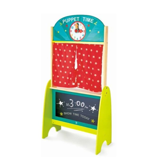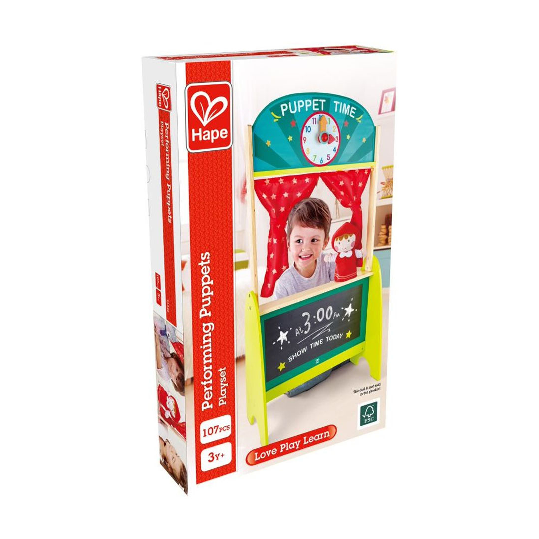 Hape Early Explorer Ξύλινο Κουκλοθέατρο (E8662).Κάντε μια υπέροχη παράσταση για τους φίλους και την οικογένειά σας με αυτό το μαγικό κουκλοθέατρο! Ρυθμίστε την ώρα της παράστασης στο ρολόι πάνω από την σκηνή, διαφημίστε την παράστασή σας στον μαυροπίνακα στο κάτω μέρος της σκηνής,περιμένετε μέχρι το κοινό σας να καθίσει και στη συνέχεια φορέστε τις μαριονέτες σας, ανοίξτε τις κουρτίνες σας και αρχίστε την παράσταση! Ο αριθμός των διαφορετικών παραστάσεων που μπορείτε να κάνετε είναι άπειρος. Αυτό το υπέροχο διαδραστικό παιχνίδι ενθαρρύνει την αυτοπεποίθηση και την δημιουργηκότητα και είναι φανταστικό για την ανάπτυξη της φαντασίας και των δεξιοτήτων αφήγησης. Κατάλληλο για ηλικίες 3 ετών και άνω.