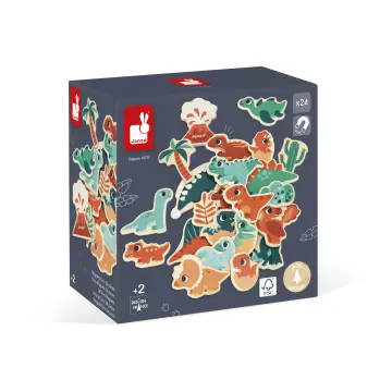 Ετοιμαστείτε για ένα ταξίδι στον χρόνο και στον κόσμο των δεινόσαυρων με τα μαγνητάκια Dino! Το παιδί σας μπορεί να σκαρφιστεί καταπληκτικές ιστορίες με τον Σπινόσαυρο, τον Στεγόσαυρο, τον Πτερανόδοντα και όλους τους άλλους δεινόσαυρους. Αυτό το σετ περιλαμβάνει 24 ξύλινα μαγνητάκια, που μπορούν να τοποθετηθούν πάνω σε μαγνητικά ταμπλό ή οποιαδήποτε άλλη μαγνητική επιφάνεια. Το παιδί σας θα αναπτύξει τη φαντασία και την επιδεξιότητά του, ενώ παράλληλα διασκεδάζει. Παιχνίδι από ξύλο πιστοποιημένο από το Συμβούλιο Διαχείρισης των Δασών (FSCTM). Για παιδιά ηλικίας από 2 ετών και άνω.