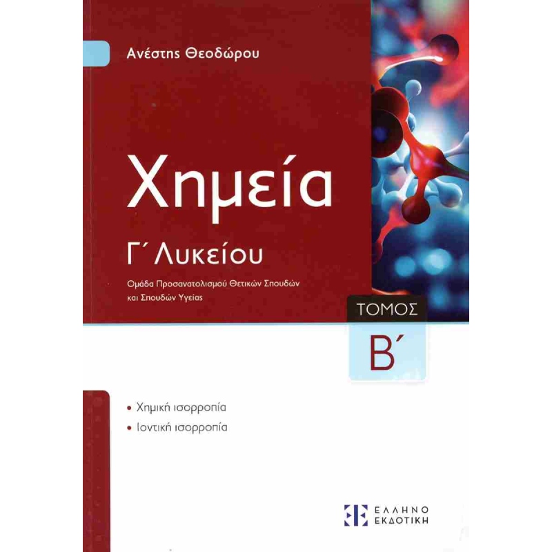 Το νέο εκπαιδευτικό βιβλίο Χημεία Γ΄ Λυκείου – Ομάδα Προσανατολισμού Θετικών Σπουδών και Σπουδών Υγείας, Β΄ τόμος περιέχει τα κεφάλαια: 5. Χημική ισορροπία και 6. Ιοντική ισορροπία.
